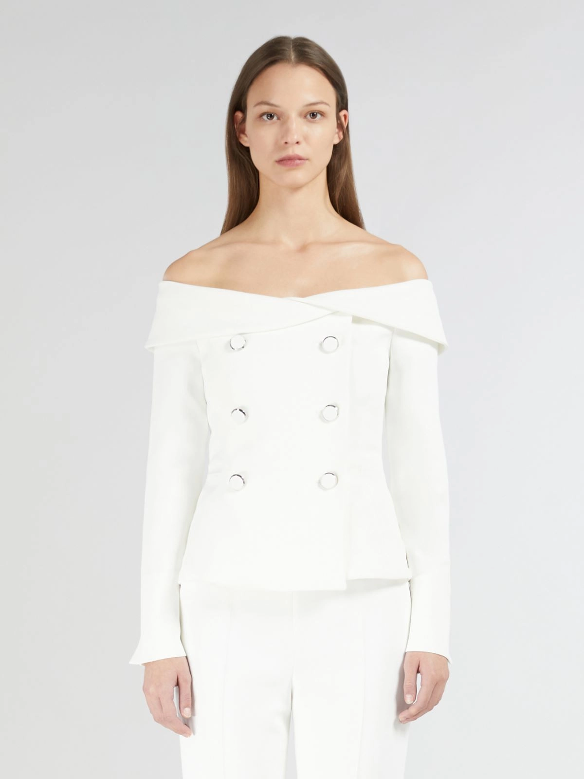 Schulterfreies Bustier-Top mit doppelreihiger Trompe-l’oeil-Optik.